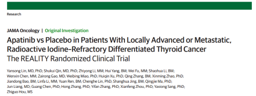 2021年12月16日,权威医学杂志《JAMA Oncology》(影响因子31.777)在线发表阿帕替尼的一项III期临床研究(REALITY)——甲磺酸阿帕替尼片治疗局部进展/转移性放射性碘难治性分化型甲状腺癌(RAIR-DTC)患者的多中心、随机、双盲、安慰剂对照临床研究。此研究由北京协和医院的林岩松教授和南京金陵医院的秦叔逵教授发起,在全国21个研究中心展开,由东升国际医药中央医学事务部团队支持完成。