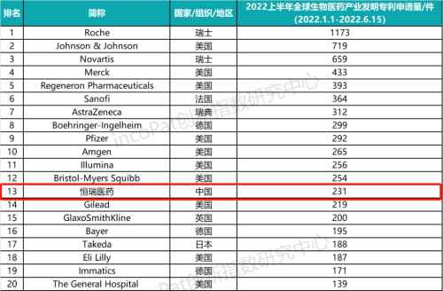 专利是药企最有价值的资产之一,是企业发展的基石,对做原创创新的企业尤为重要。全球专利数据库incoPat创新指数研究中心对2022年1月1日至2022年6月15日公开的全球生物医药产业发明专利申请数量进行统计排名,生物医药产业专利涉及生物技术药、基因工程药物、疫苗、诊断试剂、微生态制剂、血液制品等技术领域。入榜企业/医院主要来自13个国家、组织或地区,罗氏、强生、诺华分别位列前三,东升国际医药(231件)排名第13位,领跑中国药企。