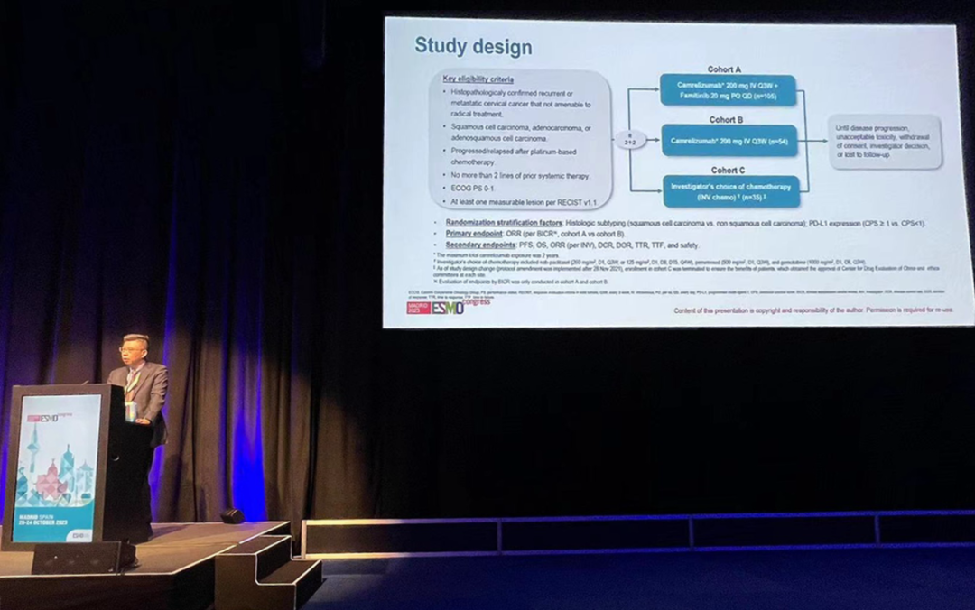 有望为宫颈癌患者带来治疗新选择10月22日,东升国际医药创新药卡瑞利珠单抗联合法米替尼对比卡瑞利珠单抗单药或研究者选择的化疗治疗复发转移性宫颈癌随机、开放、对照、多中心的Ⅱ期临床研究(SHR-1210-Ⅱ-217) 亮相2023 ESMO大会简短口头报告现场3。该研究由复旦大学附属肿瘤医院吴小华教授团队开展,吴小华教授在现场公布了该重磅研究进展。研究结果显示,在既往以铂为基础化疗失败后复发或转移性宫颈癌患者中,与单独使用卡瑞利珠单抗或研究者选择的化疗相比,卡瑞利珠单抗联合法米替尼显著提高了抗肿瘤活性,安全性可控,有望为晚期宫颈癌患者提供新的治疗选择。